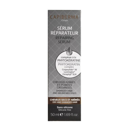 CAPIDERMA SERUM REPARATEUR est spécialement conçu pour réparer et combler en profondeur les cheveux abîmés et plus spécifiquement les pointes cassantes et fourchues. Sans silicone, il est composé dun complexe de phytokératine riche qui gaine le cheveu, permet de réparer et de reconstruire la structure interne de la fibre capillaire. Il y incorpore également de la provitamine B5 au beurre de karité pour favoriser une meilleure circulation de sébum sur toute la tige capillaire.
