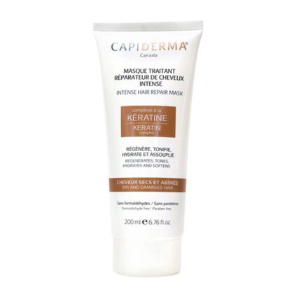 Le masque réparateur intense CAPIDERMA® est spécialement conçu pour aider visiblement à hydrater, tonifier et assouplir les cheveux secs et abîmés. Sans formaldéhydes, sans parabènes. Enrichi d’un mélange naturel en beurre de karité, d’huile d’avocat et de jojoba ainsi que d’extraits de plantes et de fruits connus pour des propriétés hydratantes, nourrissantes et revitalisantes. Il est composé d’un complexe de protéines de kératine exclusif restructurant, réducteur de frisottis et assouplisseur de boucles pour des cheveux d’apparence plus lisses et plus brillants.