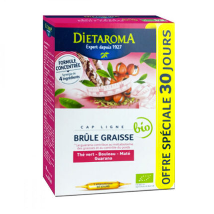 Cap Ligne Brûle Graisse de Dietaroma est une association judicieuse de plantes pour brûler efficacement les graisses de réserve et suivre une cure minceur efficace. A base de guarana, thé vertmaté et sève de bouleau, Cap Ligne Brûle graisse agit à la fois sur les graisses et la rétention d'eau. Issues de l'agriculture biologiques, les plantes sont de haute qualité et très concentrées pour une efficacité maximale. Ce complément alimentaire est indiqué pour : - Contrôler le poids en brulant les graisses. - L'élimination rénale de l'eau.