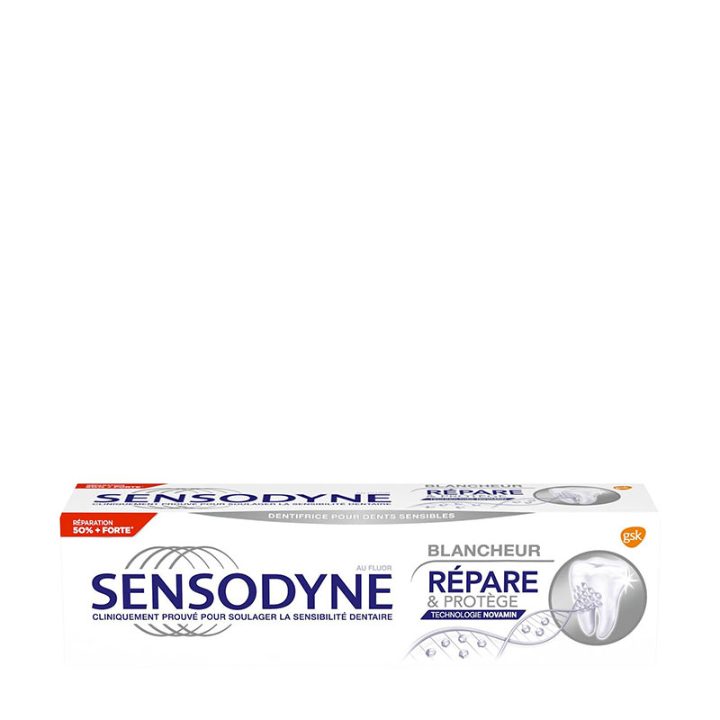 Le nouveau dentifrice Sensodyne Répare & Protège Blancheur forme une couche protectrice solide autour des zones fragilisées de vos dents sensibles pour permettre une réparation renforcée. Grâce à sa formule unique à base de NOVAMIN, il est cliniquement prouvé qu’il aide à réparer ces zones fragilisées avec des constituants naturels de vos dents pour soulager la douleur causée par la sensibilité dentaire et pour vous aider à profiter de la vie sans vous inquiéter de vos dents sensibles.